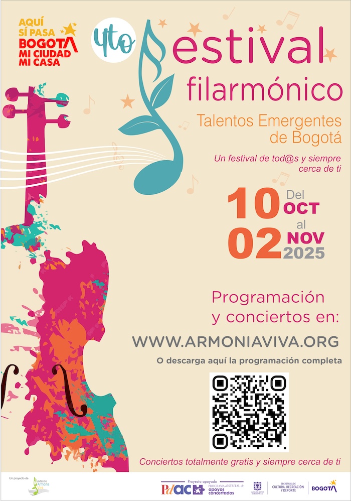 Prográmate del 10 de octubre al 02 de noviembre de 2025, ven y disfruta del mejor plan de fin de semana en familia, espacios no convencionales convertidos en escenarios de espectáculos públicos, para que disfrutes de los mejores conciertos y artistas emergentes de la música filarmónica y sinfónica deBogotá.